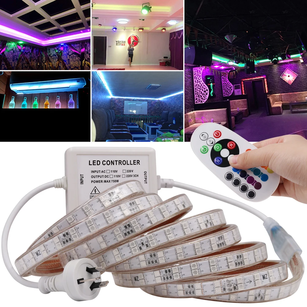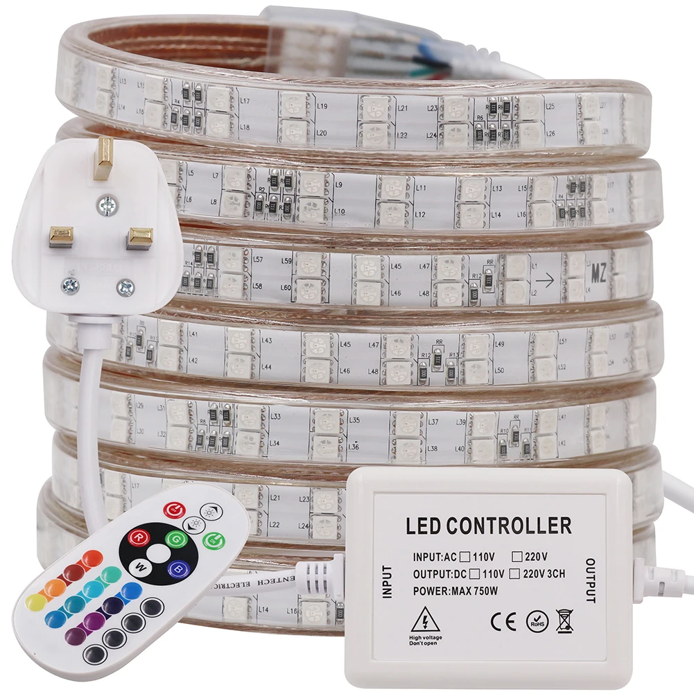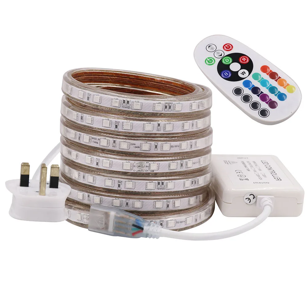 Specifica: Colore: SMD 5050 RGB (Rosso, verde, blu, bianco,,,,) Quantità del LED: singola fila: 60 LEDS/M, doppia fila: 120leds/m Impermeabile Rate: IP67 Impermeabile Tensione di Funzionamento: AC220-240V angolo di Vista: 120